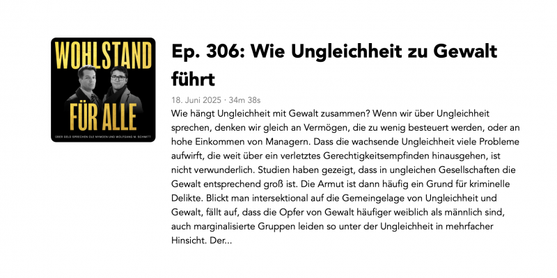 Wohlstand für Alle, Ep. 306 | Wie hängt Ungleichheit mit Gewalt zusammen? Wenn wir über Ungleichheit sprechen, denken wir gleich an Vermögen, die zu wenig besteuert werden, oder an hohe Einkommen von Managern. Dass die wachsende Ungleichheit viele Probleme aufwirft, die weit über ein verletztes Gere...