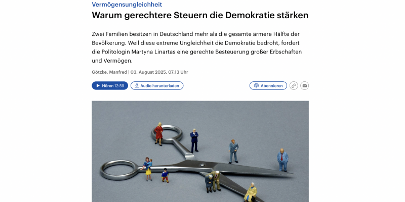 Deutschlandfunk | Interview von Manfred Götzke mit Politologin Dr. Martyna Linartas | Zwei Familien besitzen in Deutschland mehr als die gesamte ärmere Hälfte der Bevölkerung. Weil diese extreme Ungleichheit die Demokratie bedroht, fordert die Politologin Martyna Linartas eine gerechte Besteuerung g...